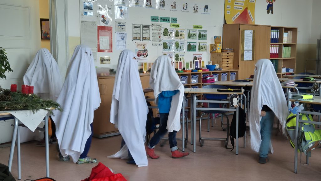 Die Kinder tauchten begeistert in die Welt des Films vor aber auch hinter der Kamera ein. Bevor wir mit dem Projekt begannen, machten wir uns zunächst Gedanken über eine spannende Weihnachtsgeschichte, die wir verfilmen könnten. Matthias Grüneisl, der Leiter des Kurses, erklärte uns den Umgang mit der Filmkamera, damit die Kinder die Aufnahmeleitung übernehmen konnten. Dann durften die Schüler ihre schauspielerischen Fähigkeiten unter Beweis stellen und schlüpften dabei in verschiedene Rollen. Drehorte für den Weihnachtsfilm waren dabei u.a. unser Klassenzimmer, der Hausflur und Kellerräume der Schule. Matthias erklärte uns, dass ein Film aus verschiedenen Szenen zusammengesetzt ist. So wurden an jedem Drehtag immer nur bestimmte Szenen gedreht. Auch das Team aus Kameramann/frau, Aufnahmeleiter/in und Tonassistent/in war sehr konzentriert bei der Sache.