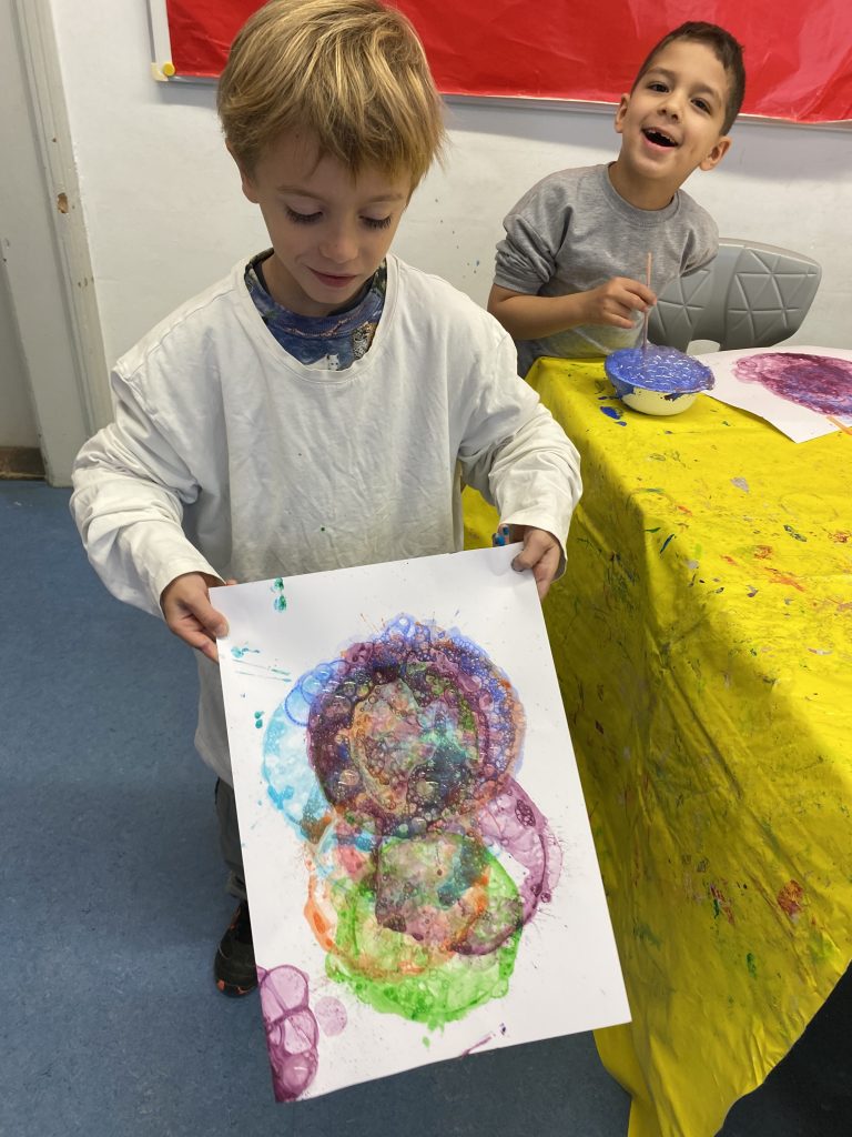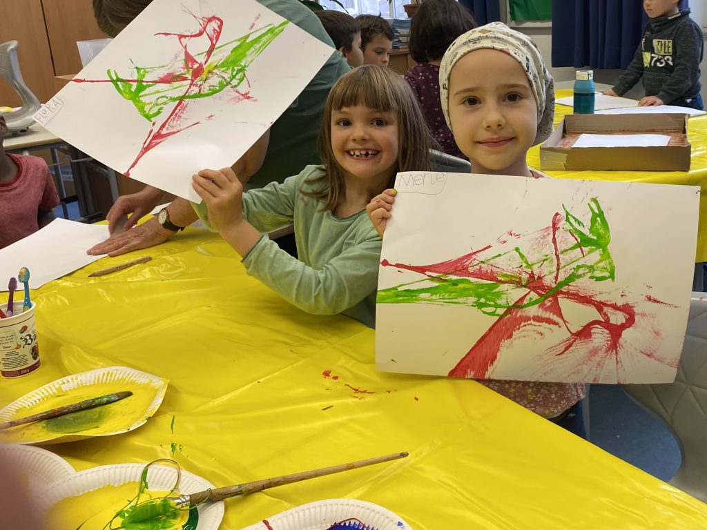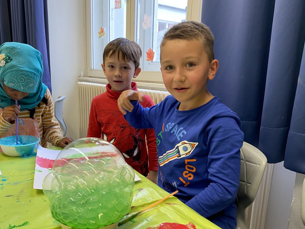 An verschiedenen Stationen experimentierten die Kinder mit Farben und probierten spannende Techniken aus. Mit Seifenblasen entstanden zarte, bunte Muster, beim Fadendruck zauberten die Kinder tolle Formen und mit Murmeln rollten sie fröhliche Farbschlieren aufs Papier.